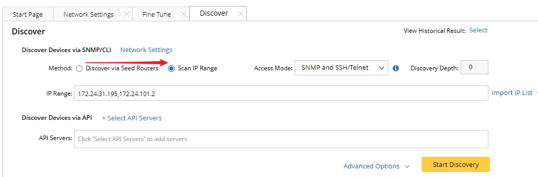 When you want to rediscover devices from Fine Tune, either from Missed Devices or from Unknown SNMP SysObjectID, the IP addresses of the selected devices are automatically transferred to the Discovery page and entered into the IP Range field. Unfortunately, the selected scan method is not correct. Instead of Scan IP Range it is set to Discover via Seed Routers. And we definitely want to scan the selected IPs, nothing else.